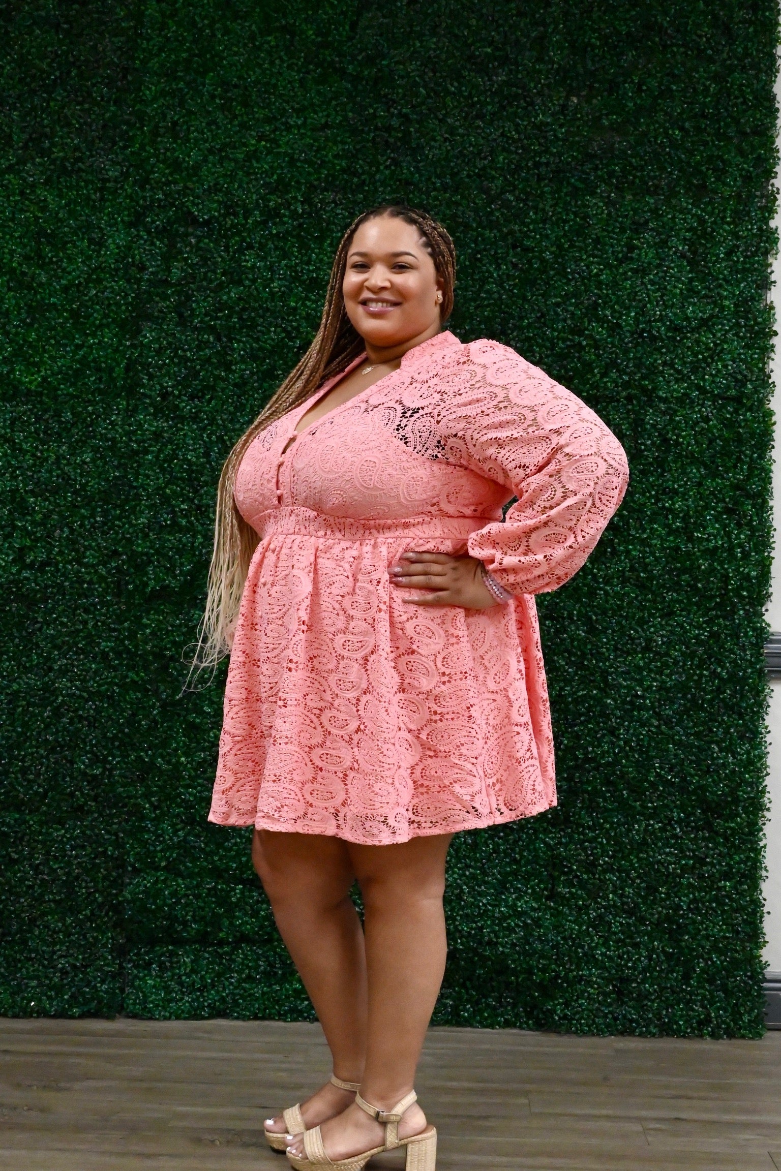 Treat yourself to a lacey little number with the Aubree Mini Dress! Flaunt those curves with this sassy V-neck stunner, featuring long, elegant sleeves for an extra touch of sophistication. Pretty in pink, this blush dream is perfect for a night on the town! Get creative with accessories and show off your style.