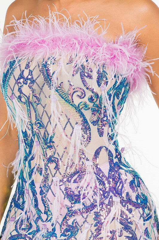 Introducing the Ember Mini Dress! Sparkle and shine with this sequin mini dress that's perfect for any occasion. Featuring a strapless design, you'll feel confident and free to move all night long. Get ready to turn heads and make a statement in this feathered dress.