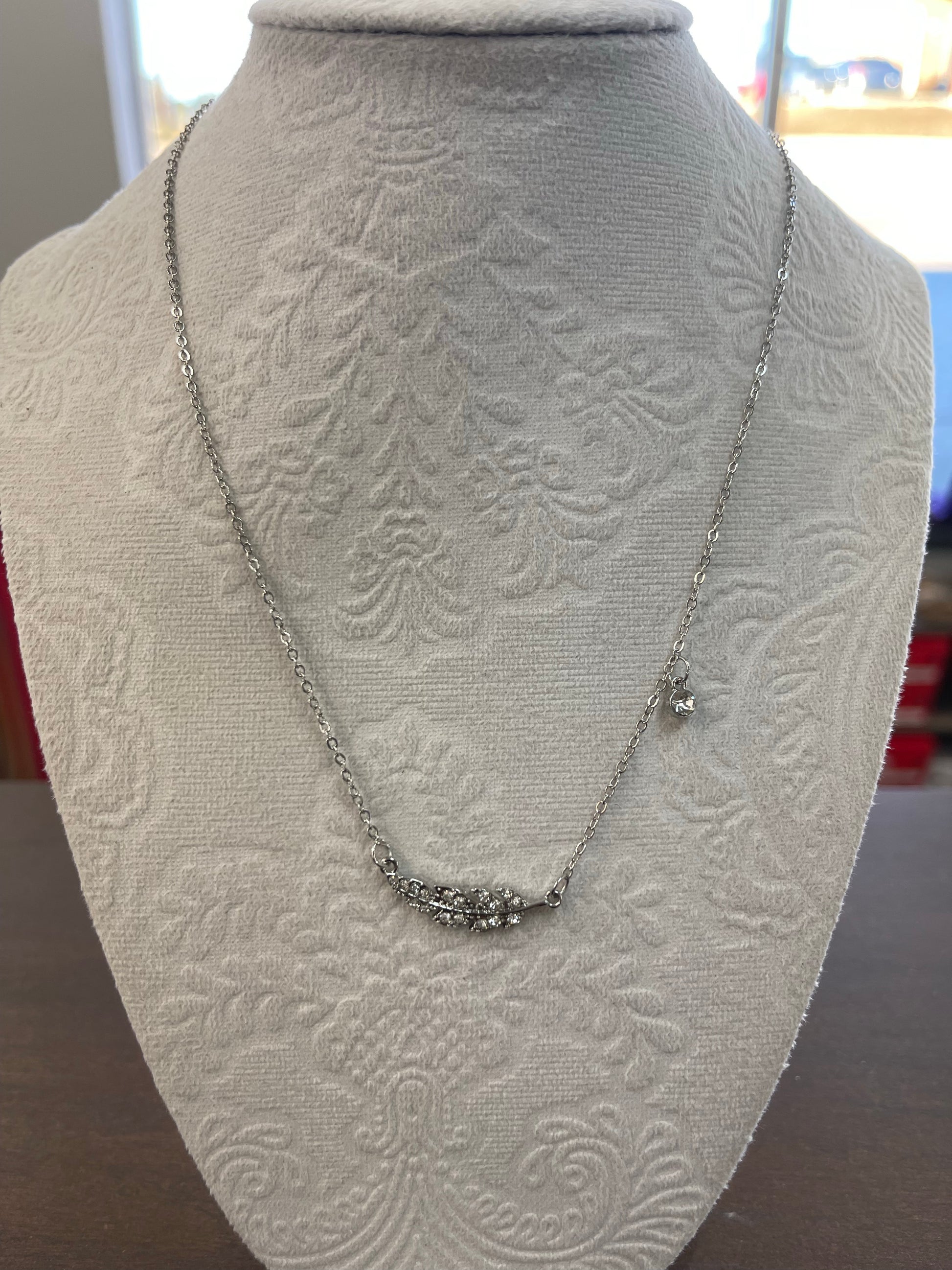 Silver Leaf Clavicle Necklace. Rhinestone detail in leaf and individual stone detail.
