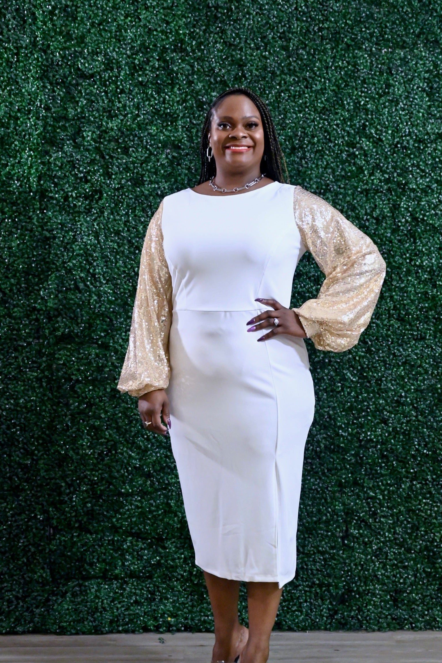Ivory Midi Dress with Gold sequin bell sleeves.