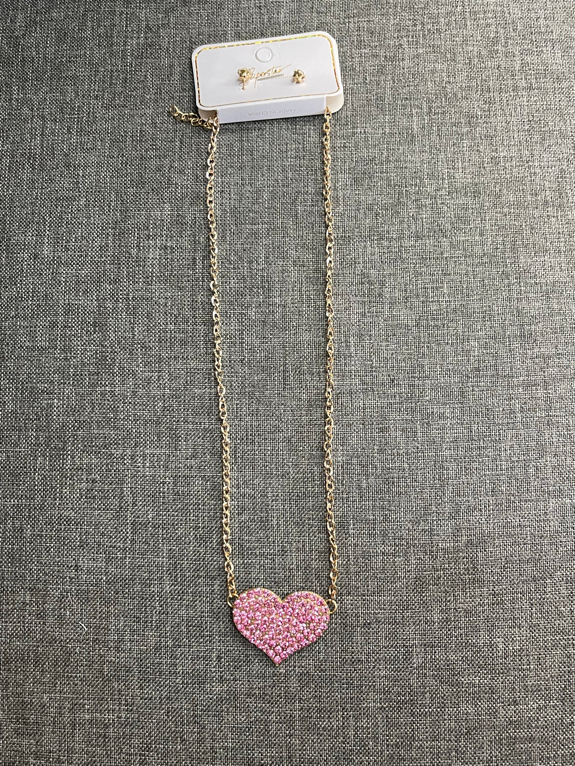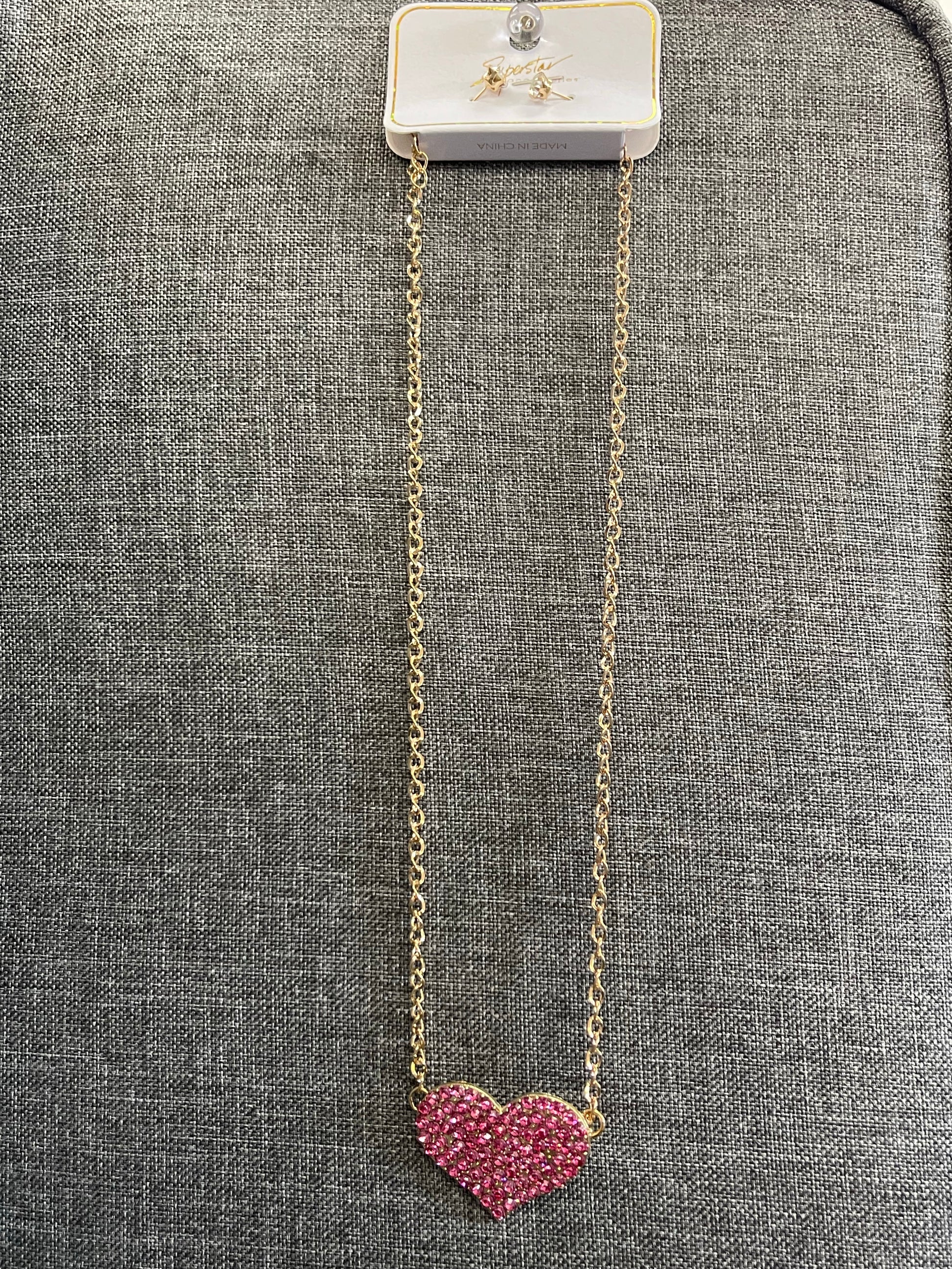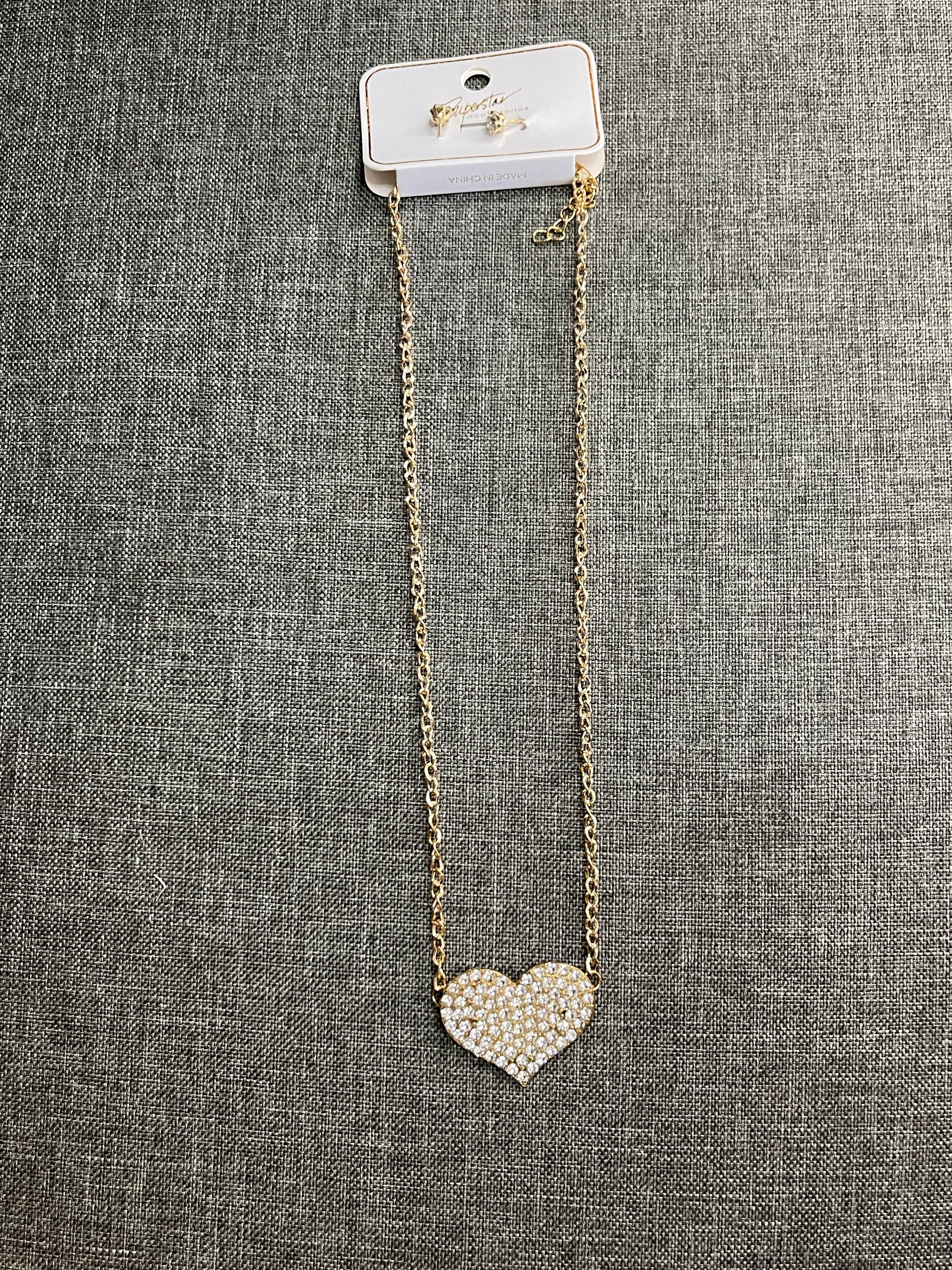 Rhinestone heart on gold chain with rhinestone stud earrings.