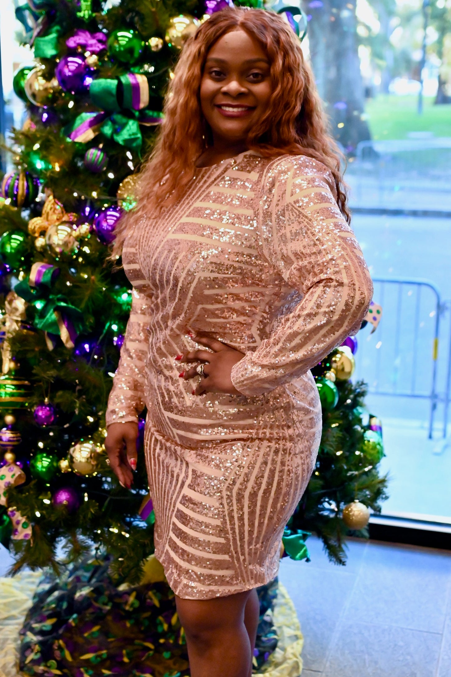 Long sleeve sequin dress with open back cut out.